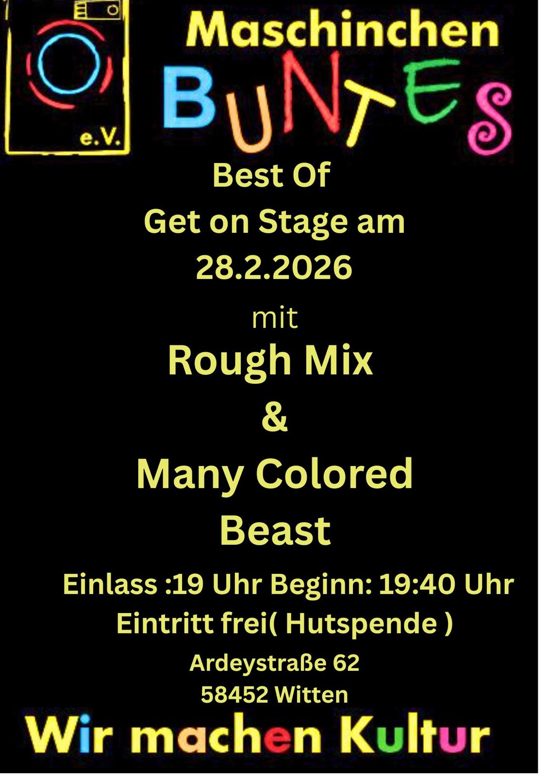 Am 28.02.026 treten wir beim "Best of Get on Stage" im "Maschinchen Buntes" auf. Zusammen mit "Rough Mix" gestalten wir den Abend und freuen uns auf Euch!